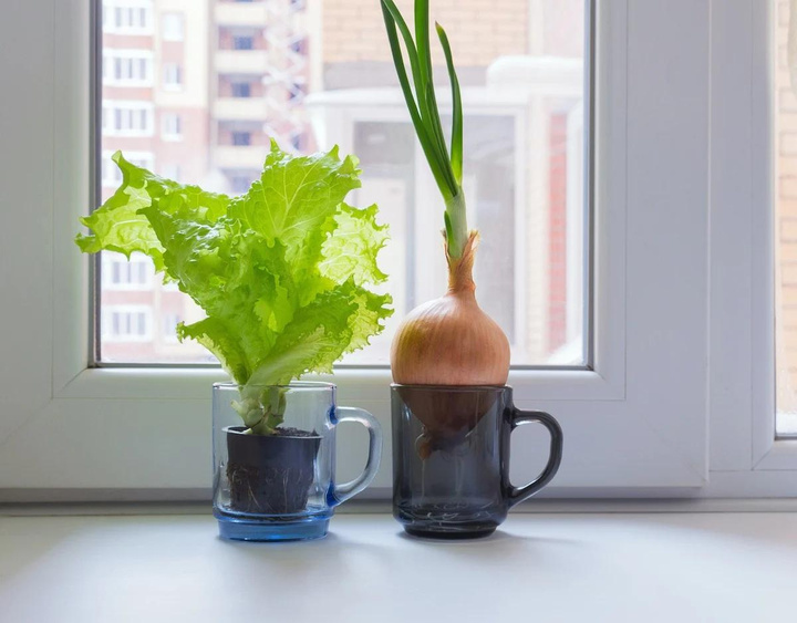 Another simple one to regrow from scraps are bulbs, such as yellow or red onions. Simply cut a one-inch piece off the root end of the onion and set it on the ground or in a bowl of shallow water with the cut surface above the water. It will soon begin to regenerate its roots which can then be planted in soil. You can even set an entire onion in water and watch it sprout! Then it can be planted outside in the garden.