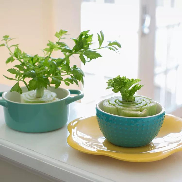 Cut stalks off about two inches from the bottom of the celery bunch and place that white base in a shallow bowl of water, spraying the top daily to keep it moist
